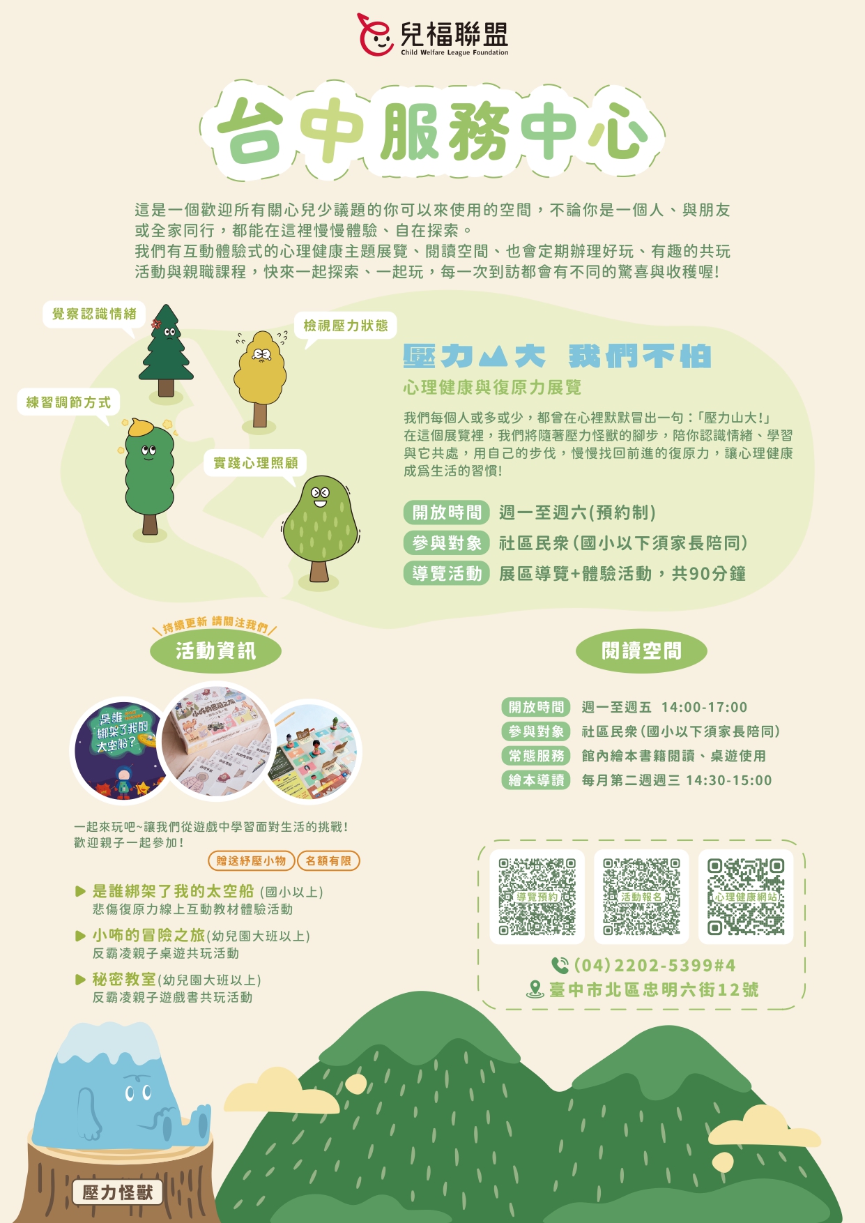 新址開辦「壓力山大 我們不怕」心理健康與復原力展覽、親子活動及閱讀空間(詳見附件活動DM),歡迎參加