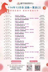 2. 臺中市家庭教育中心邀您一起參與本月精彩多元的課程活動~從親職教育、婚姻經營、數位教養、青少年溝通、幼兒教養到性別教育及婚前交往準備等主題應有盡有,讓我們在溫馨互動的氛圍中學習,累積創造幸福、和諧家庭的力量!更多詳細內容洽臺中市家庭福利中心活動海報、FB及LINE公告資訊。