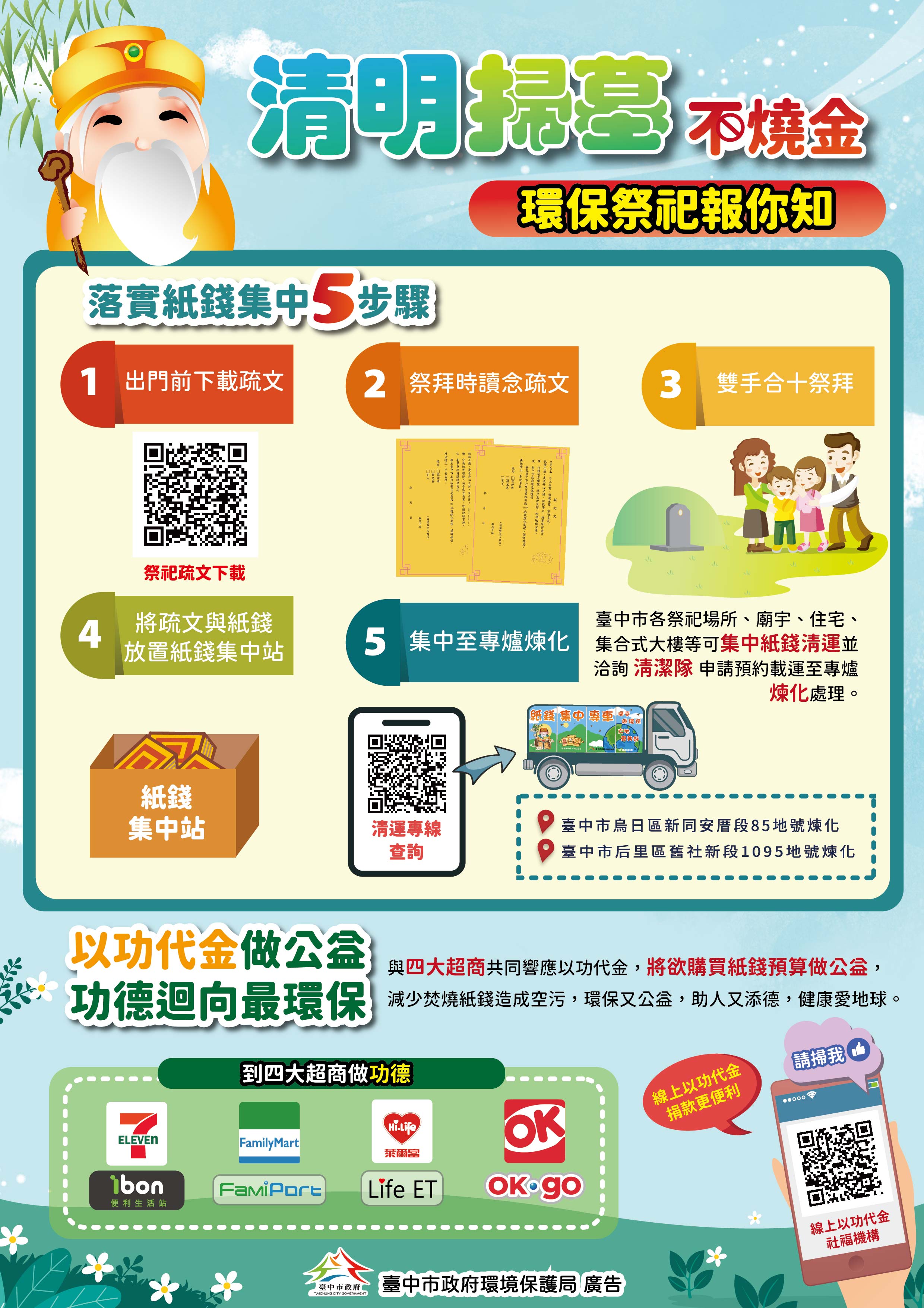 清明連假將至,祭祖掃墓請勿以露天燃燒雜草方式整理墓地,多採取紙錢減量集中燒、以功(米)代金等環保措施,避免焚燒不慎而引發火災,以顧及民眾安全。