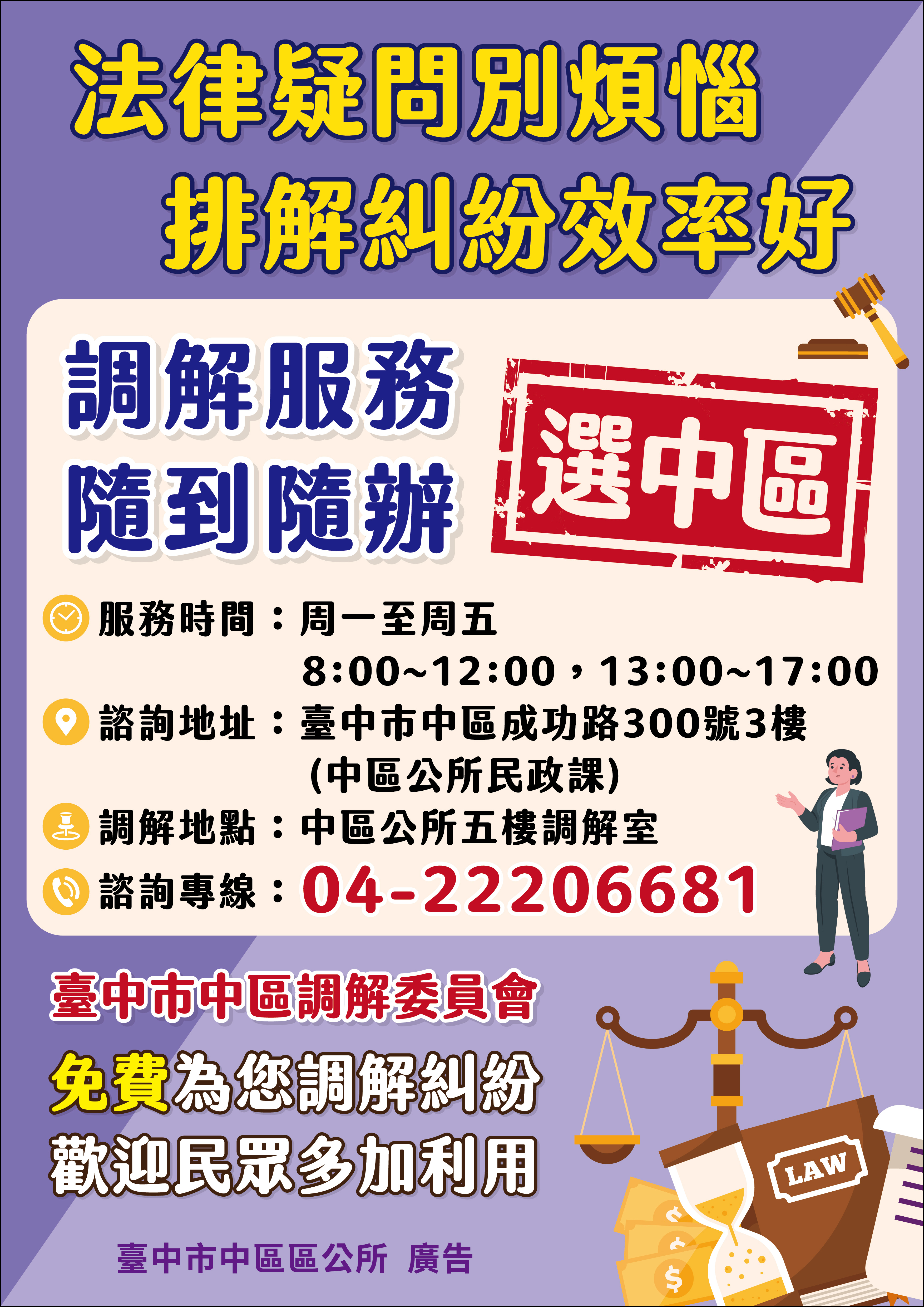 別擔心!【中區調解委員會】與【法律諮詢服務】是您最強大的後盾。