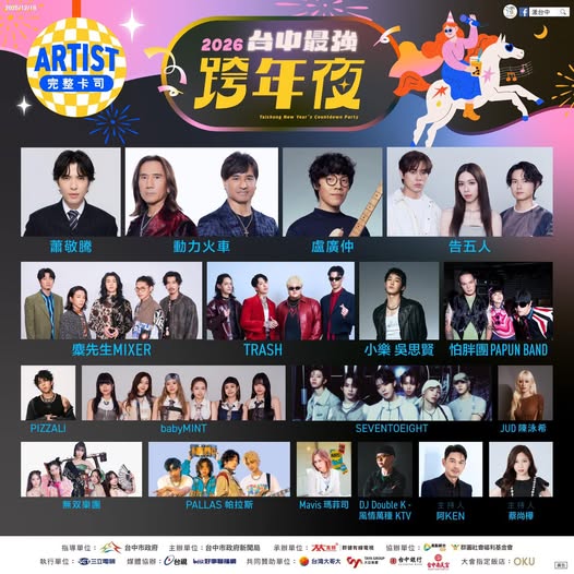 今年臺中跨年獨家邀請金曲歌王蕭敬騰登台演出,並集結盧廣仲、告五人、動力火車、麋先生MIXER、TRASH、怕胖團等橫跨不同世代與音樂風格的超人氣藝人,打造全台最具指標性的跨年舞台。除演唱會外,跨年夜還將施放180秒大型煙火秀,讓市民在水湳中央公園的開闊視野中,迎接最震撼的新年倒數。